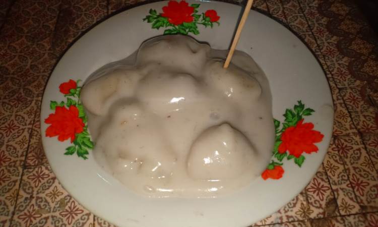Makanan ini terbuat dari tepung beras yang diaduk dan dicampur dengan pisang batu. Kemudian hasil dari campuran tersebut akan dibuat bentuk bulat-bulat. Setelah itu adonan tersebut akan dicampur dengan santan yang sudah dididihkan terlebih dahulu.