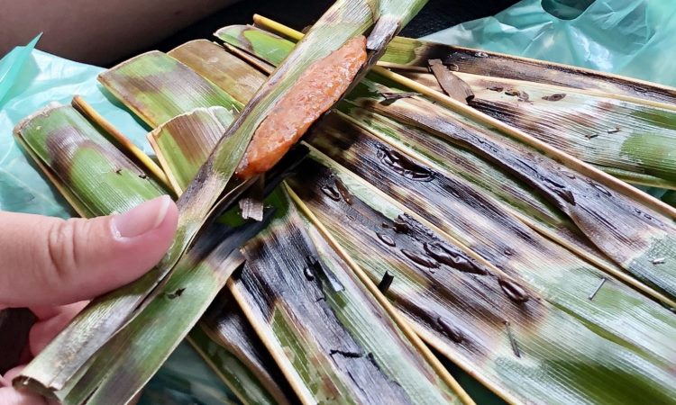 Salah satu bumbu yang tidak boleh ketinggalan adalah cabai, selain itu ditambahi pula bumbu-bumbu penyedap untuk memberikan rasa yang mantap pada makanan. Setelah adonan jadi, kemudian dibungkus daun dan dibakar dalam arang.